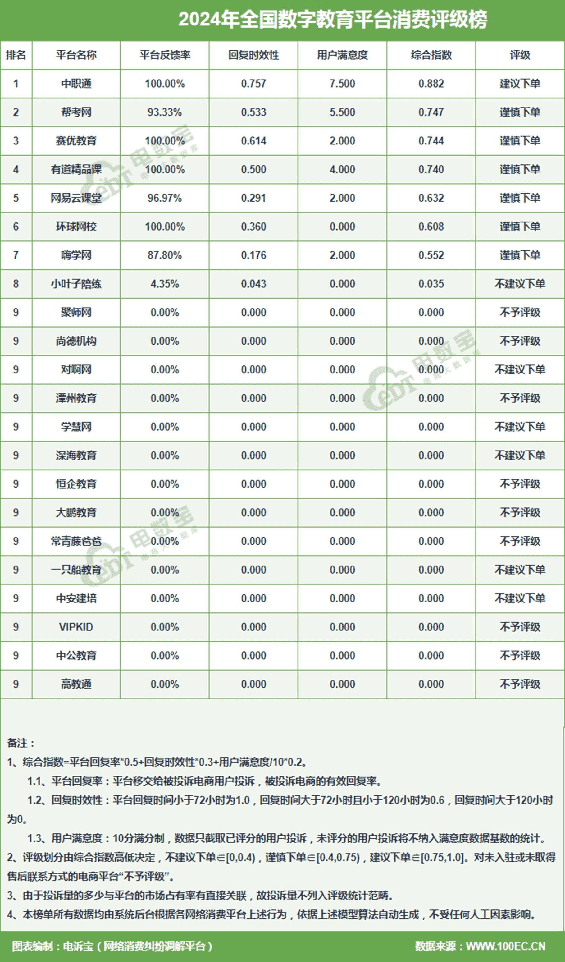 在“2024年全国数字教育平台消费评级榜”中,中职通获“建议下单”评级;帮考网、赛优教育、有道精品课、网易云课堂等6家获“谨慎下单”评级;聚师网、尚德机构、潭州教育、恒企教育、大鹏教育、常青藤爸爸、芸学教育、VIPKID、中公教育、高教通获“不予评级”;小叶子陪练、对啊网、学慧网、深海教育、一只船教育、中安建培获“不建议下单”评级。