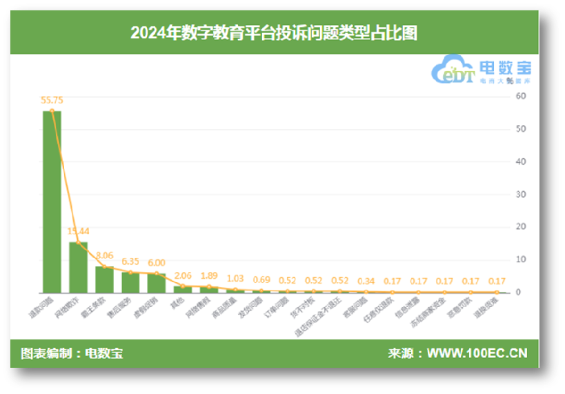 据“电诉宝”显示,2024年全国数字教育用户投诉问题类型有:退款问题,占比最高,达55.746%;其次为网络欺诈,占比15.437%;排在第三的是霸王条款,占比8.062%。此外,还有售后服务、虚假促销、其他、网络售假、商品质量、发货问题、订单问题、货不对板、客服问题、信息泄露等问题。