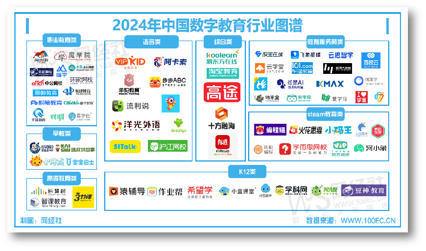 按教学阶段可分为:学前教育、K12教育、高等教育、职业教育等。而广义上的数字教育还包括知识付费、在线阅读、智慧教育、教育硬件等。
