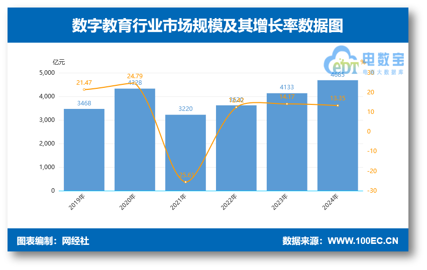 据“电数宝”大数据库监测数据,2024年数字教育市场规模为4685亿元,同比增长13.35%。