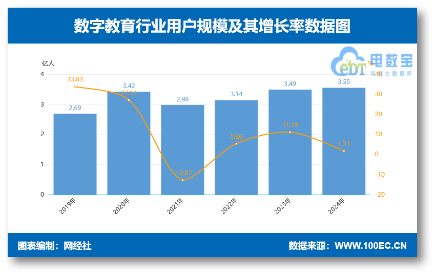 据“电数宝”显示,2024年数字教育用户规模为3.55亿人,同比增长1.71%。
