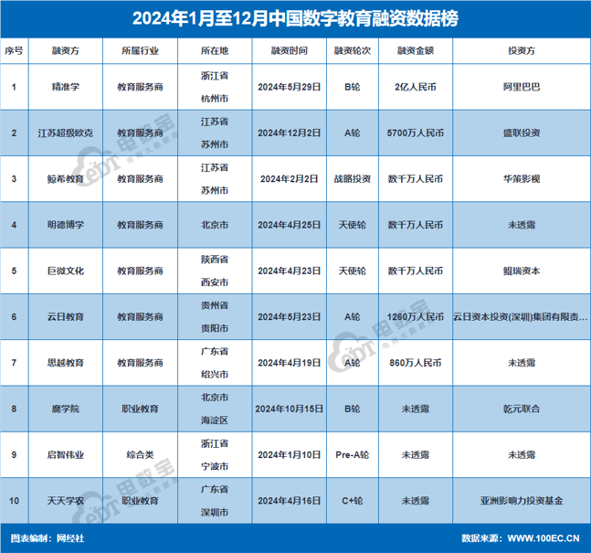 “电数宝”数据显示,2024年数字教育融资事件数共10起,融资方包括云日教育、江苏超级欧克、魔学院、精准学、明德博学、巨微文化、思越教育、天天学农、鲸希教育、启智伟业