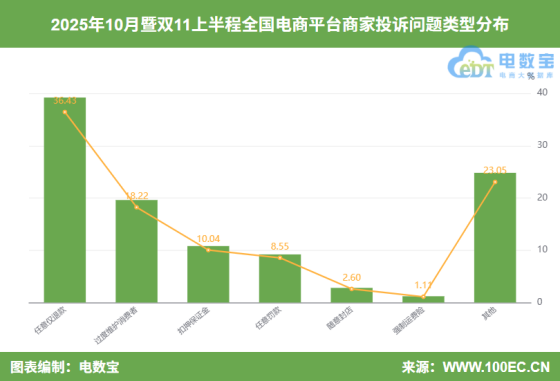 据“电诉宝”显示,10月暨双11上半程全国电商平台商家投诉问题主要集中在这六项,其中任意仅退款占比高达36.43%,排在第一;其余问题类型依次为:过度维护消费者(18.22%)、扣押保证金(10.04%)、任意罚款(8.55%)、随意封店(2.60%)、强制运费险(1.11%)。