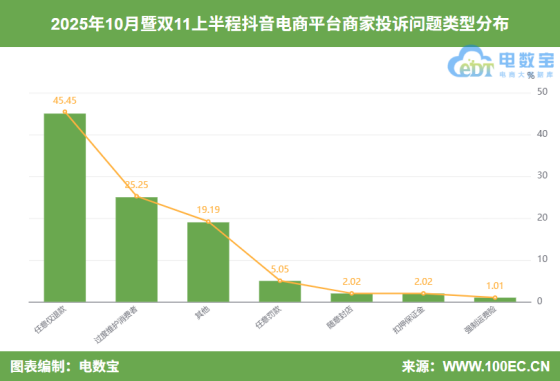 据“电诉宝”显示,10月暨双11上半程抖音电商平台涉及的99份商家投诉,问题类型主要集中在这六项,其中任意仅退款占比最高,为45.45%;其余问题类型依次为:过度维护消费者(25.25%)、任意罚款(5.05%)、随意封店(2.02%)、扣押保证金(2.02%)、强制运费险(1.01%)。