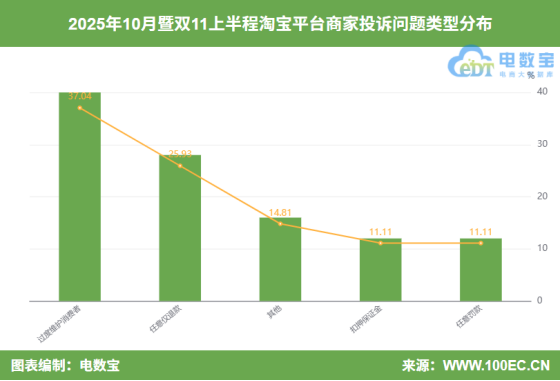 据“电诉宝”显示,10月暨双11上半程淘宝平台涉及的商家投诉问题类型主要集中在:过度维护消费者(37.04%)、任意仅退款(25.93%)、扣押保证金(11.11%)、任意罚款(11.11%)。
