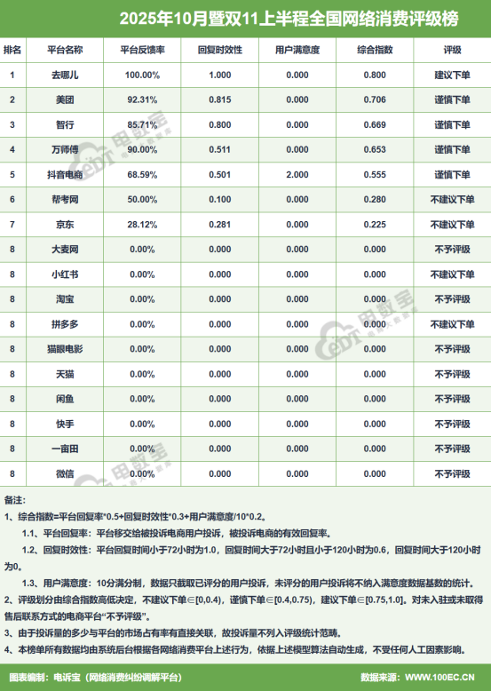 在报告公布的《2025年10月暨双11上半程全国网络消费评级榜》中:获“建议下单”的有:去哪儿;获“谨慎下单”评级的有:美团、智行、万师傅、抖音电商;获“不建议下单”的有:帮考网、小红书等;获“不予评级”的有:大麦网、淘宝、猫眼电影、天猫、闲鱼、快手、一亩田、微信。