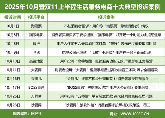 【315通报】淘票票 猫眼电影 智行 飞猪 高德地图 大麦网 去哪儿 BOSS直聘 万师傅 珍爱网入选10月暨双11上半程生活服务电商十大典型投诉案例
