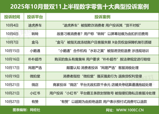 报告涵盖了数字零售、生活服务电商两大板块,公布了2025年10月暨双11上半程网络消费投诉数据及《数字零售十大典型投诉案例》和《生活服务电商十大典型投诉案例》。