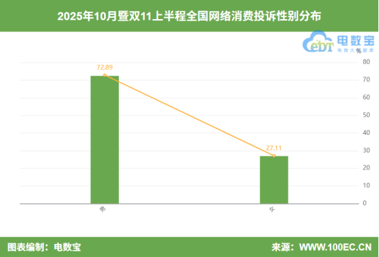 据“电诉宝”显示,10月暨双11上半程男性用户投诉比例为72.89%,女性用户投诉比例为27.11%。