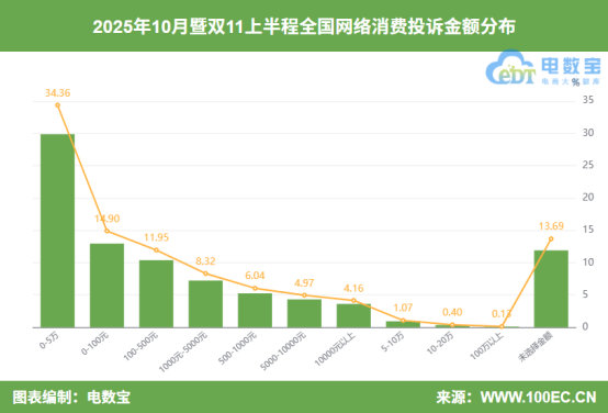 据“电诉宝”显示,10月暨双11上半程投诉金额分布主要集中在0-5万(34.36%)、0-100元(14.90%)、100-500元(11.95%)、1000-5000元(8.32%)、500-1000元(6.04%)、5000-10000元(4.97%)、10000元以上(4.16%)、5-10万(1.07%)、10-20万(0.40%)、100万以上(0.13%)。