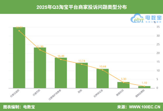 据“电诉宝”显示,Q3淘宝平台涉及的182份商家投诉,问题类型主要集中在:任意仅退款(32.97%)、任意罚款(21.98%)、过度维护消费者(16.48%)、扣押保证金(10.44%)、随意封店(3.30%)、强制运费险(1.10%)。