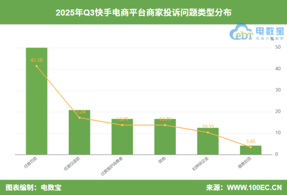 据“电诉宝”显示,Q3快手电商平台涉及的数十份商家投诉,问题类型主要集中在:任意罚款(41.38%)、任意仅退款(17.24%)、过度维护消费者(13.79%)、扣押保证金(10.35%)、随意封店(3.45%)。