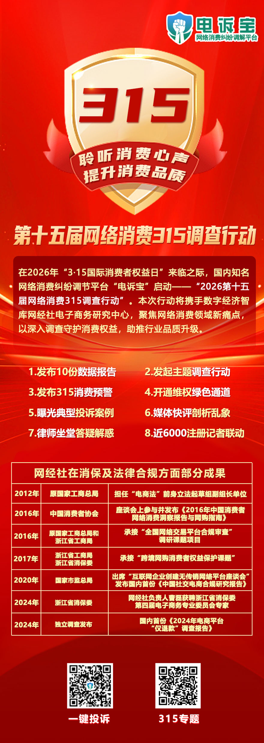 在2026年“3·15国际消费者权益日”来临之际,国内知名网络消费纠纷调节平台“电诉宝”正式启动年度重点活动——“2026第十五届网络消费315调查行动”。本次行动将携手数字经济智库网经社电子商务研究中心,聚焦网络消费领域新痛点,以深入调查守护消费权益,助推行业品质升级。