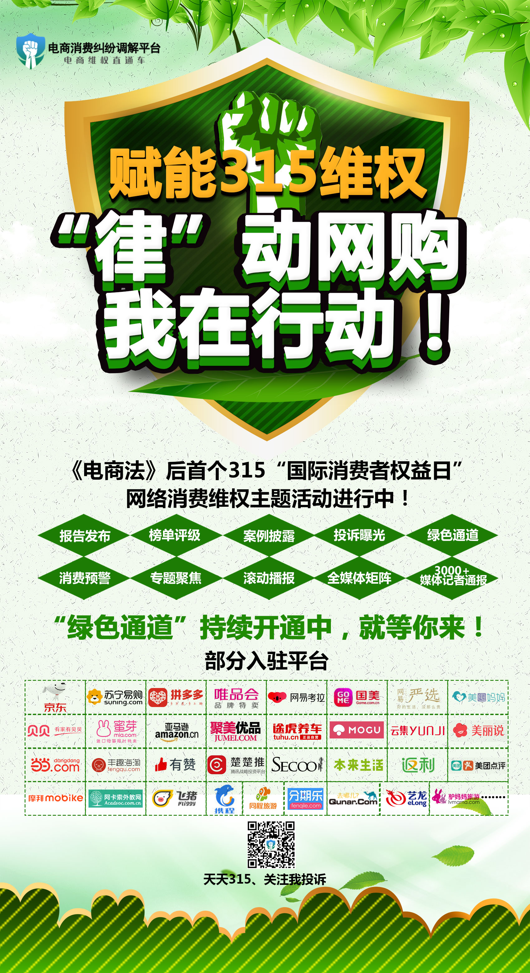 为更好帮助消费者解决网络纠纷,做好用户与电商服务的桥梁,运行八年的“电子商务消费纠纷调解平台”向广大电商平台开放“绿色通道”服务,电商可自主申请入驻,实时受理、反馈和查询用户满意度评价。实现一键投诉、24h在线、自助维权、同步直达、实时处理、进度查询、评价体系、法律求助、大数据分析等诸多功能,真正实现了“天天315”。