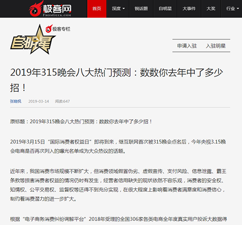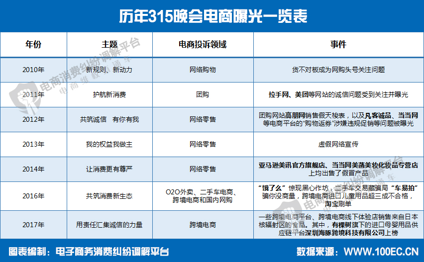 电子商务的快速发展,也滋生了例如刷单、网络售假等特有的侵权现象,电子商务行业也成为央视3·15晚会的重点关注对象。2016年央视3·15晚会互联网、电商成为的重点曝光对象,在线外卖食品安全问题、二手车电商收费猫腻、跨境进口电商产品质量、手机APP隐私安全、上门美甲O2O以及智能硬件等服务的个人信息泄露等被315晚会揭露,包括饿了么、车易拍、58到家、河狸家、大疆、淘宝、美丽说、百度钱包等十余家企业被点名。2017年央视315曝光共享单车押金难退,酷骑单车被公开点名。