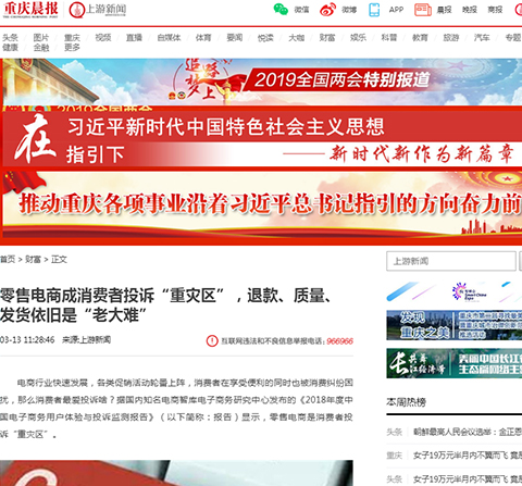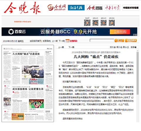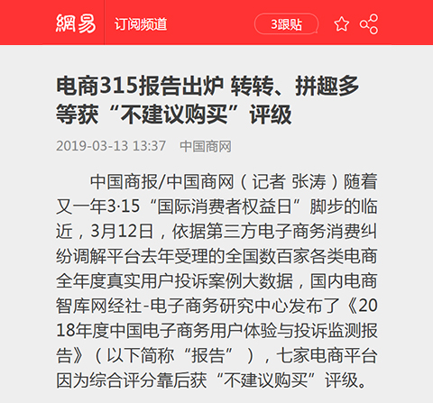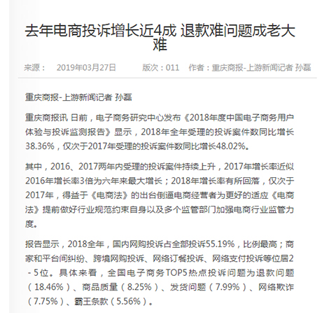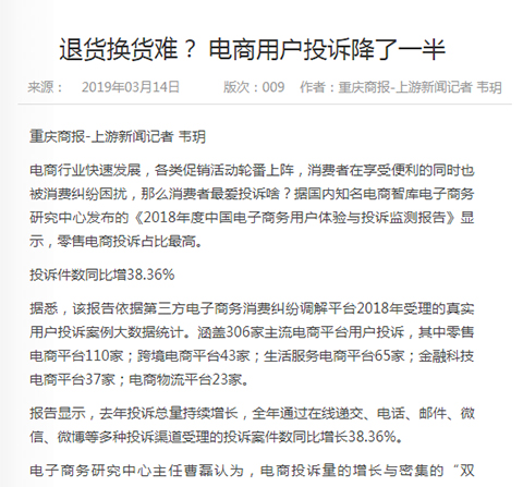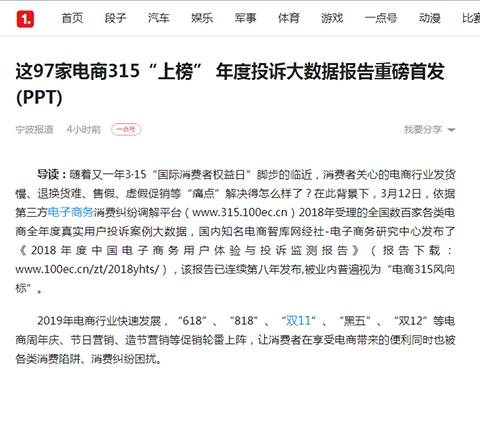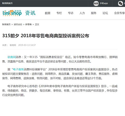 3月12日,网经社-电商中心重磅发布《2018年度中国电子商务用户体验与投诉监测报告》,已连续第八年发布,被业内视为“电商315风向标”。报告依据“电子商务消费纠纷调解平台”2018年受理的全国306家各类电商全年度真实用户投诉大数据所得(数据、评级、排名部分完全由系统监测和模型算法生成,绝无人工干预)。报告公布了“2018年全国零售电商TOP30消费评级榜”、“2018年全国跨境电商TOP10消费评级榜”、“2018年全国生活服务电商TOP20消费评级榜”,“2018年全国电商物流服务TOP10消费评级榜”“2018年全国金融科技电商TOP15消费评级榜”等7份榜单及各相关十大典型案例。【315预测】央视315晚会“上榜”电商猜想……