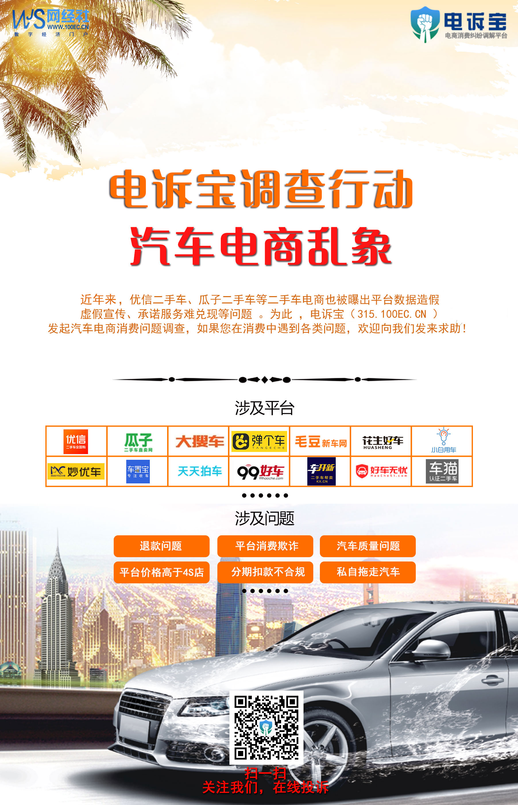为此,国内知名网络消费纠纷调解平台(www.315.100ec.cn)进行2022年数字经济调查行动之汽车电商乱象,通过发布快评、消费预警、投诉受理、滚动曝光、专题聚焦、密集播报、媒体联动、律师咨询、纠纷调解、典型通报等10大方式,关注汽车电商用户消费权益保障。欢迎网络用户在线投诉爆料。