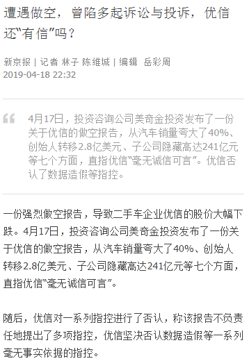 而作为同行的优信二手车也指责瓜子二手车交易数据造假、破坏行业竞争秩序。1月30日,优信二手车在官微发布《关于反对瓜子二手车交易数据造假、破坏行业竞争秩序的声明》称,瓜子二手车服务费“明收暗返”,虚增收入, “明收暗返”车辆占保卖车比例预估超过30%。优信二手车声明中提供案例显示,消费者在瓜子二手车购买标价5万元的轿车,合同价却为5.45万元,多收的 4500元由销售人员私下返还。