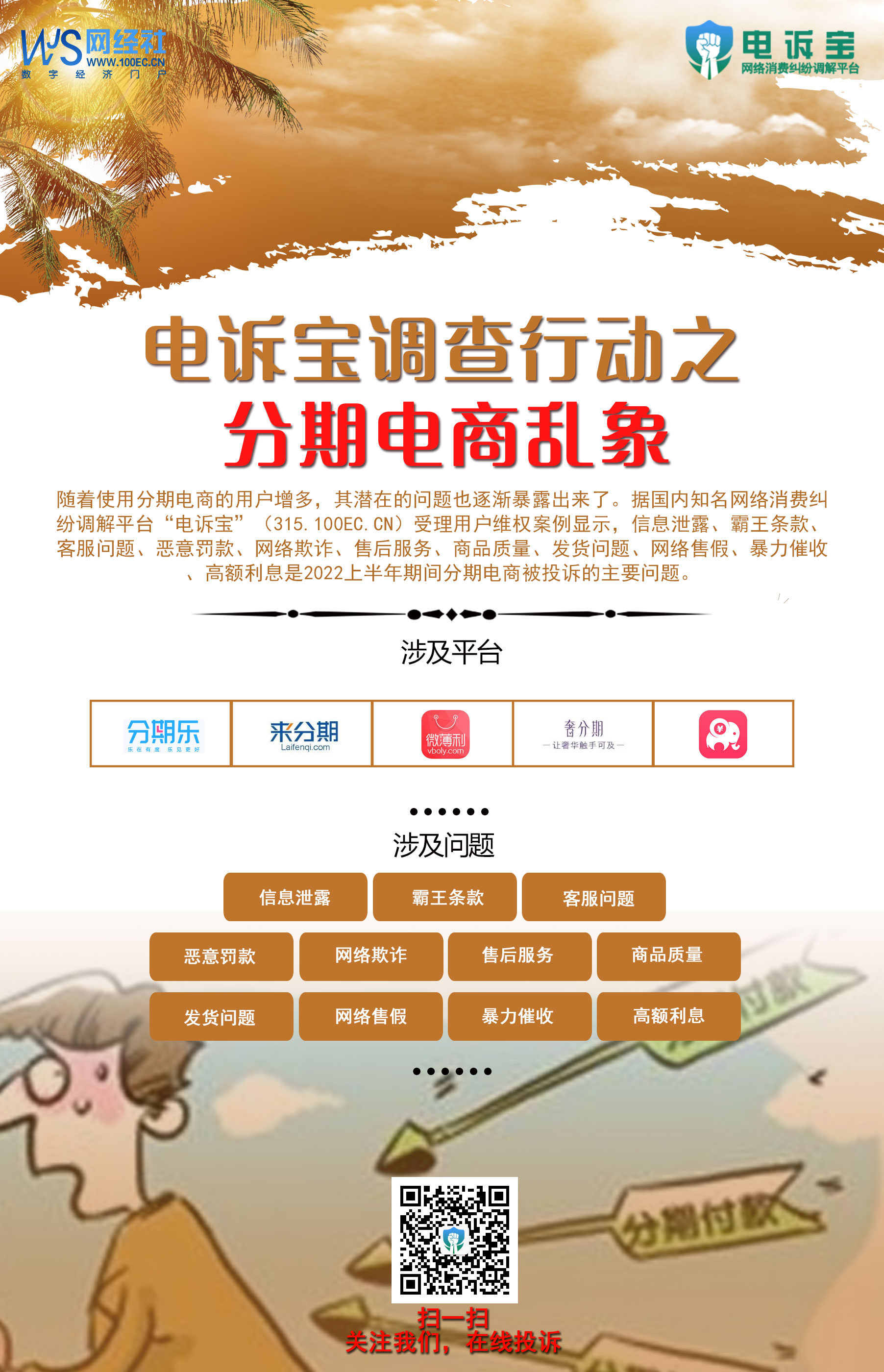 网上购物已成为人们日常生活的一个重要组成部分,而直播的出现,更是刺激了人们的购买欲,分期电商也由此兴起。随着使用分期电商的用户增多,其潜在的问题也逐渐暴露出来了。为此,“电诉宝”启动“分期电商乱象调查行动”,分析分期电商乱象。如果您也遇到相同问题,欢迎向我们提供线索。