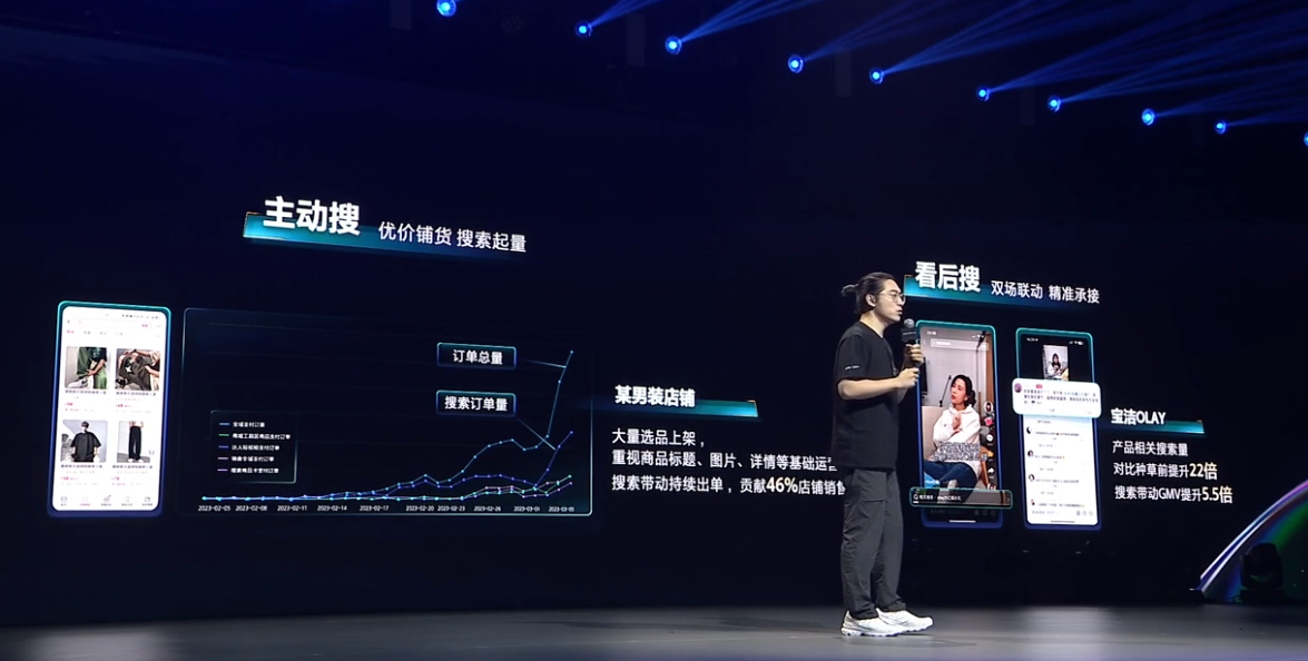 1.搜索:过去一年,抖音电商搜索意图增长了95%,接近翻倍。而带来的搜索成交GMV则是增长了159%。与传统搜索场景有所区别,抖音是重要的种草趋势发源地,得益于内容题材的丰富有趣,用户很容易被内容激发在抖音内通过“看后搜”产品链路完成一键搜索。