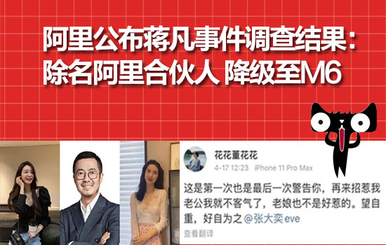 【事件概述】2020年4月17日中午,微博ID为“花花董花花”的用户公开点名张大奕,称“这是最后一次警告,再来招惹我老公我就不客气了”。随后,有网友指出“花花董花花”的老公疑为淘宝总裁兼天猫总裁”蒋凡。4月18日,阿里集团CPO(首席人力官)童文红在阿里内部论坛回复蒋凡的帖子时表示,蒋凡由于个人家庭问题没处理好,而严重影响了公司声誉。4月27日,阿里巴巴集团公布,蒋凡事件的调查处理结果为,蒋凡即日起取消阿里合伙人身份,职级从M7(集团高级副总裁)降级到M6(集团副总裁)。