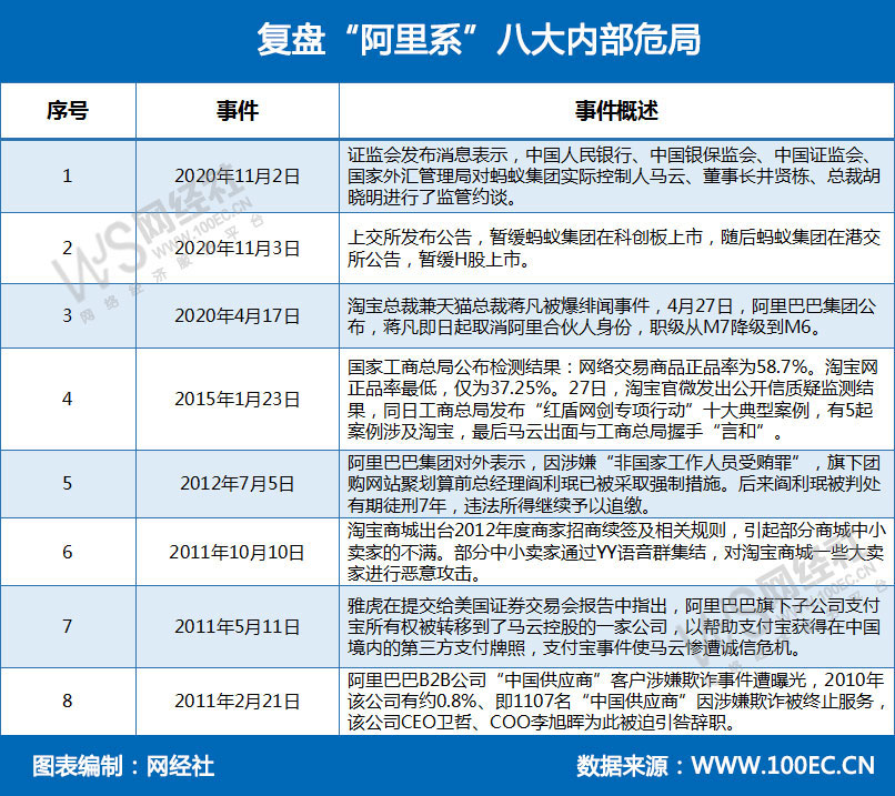 从1999年成立至今,阿里巴巴集团已经走过了21年。在阿里巴巴飞速发展的历程中,也伴随着各类危机事件的发生。例如:蚂蚁集团被暂缓上市、淘宝天猫总裁蒋凡绯闻事件、阿里千名“中国供应商”涉嫌欺诈、支付宝股权转移事件、“淘宝商城”新规遭商家围攻等。对此,网经社(100EC.CN)对“阿里系”历年来发生的八大内部危局进行盘点。