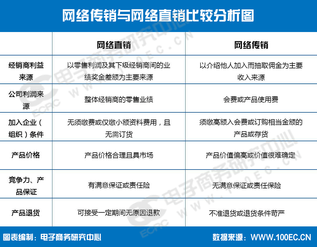 传销与直销在计酬方式、加入条件、产品价格、质量、售后服务等方面有明显差异。大致通过三个特征识别网络传销。