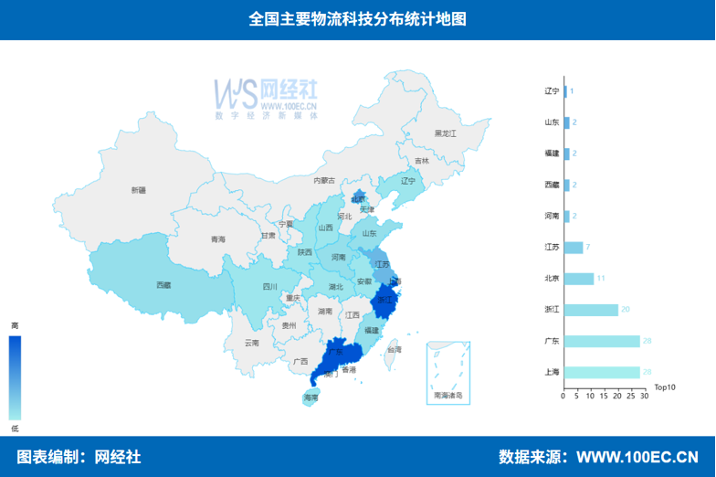 网经社企业库显示,主要物流科技企业有111家,其中广东、上海均分布了28家,浙江20家,北京11家,江苏7家,河南、西藏、福建、山东均2家,辽宁1家。