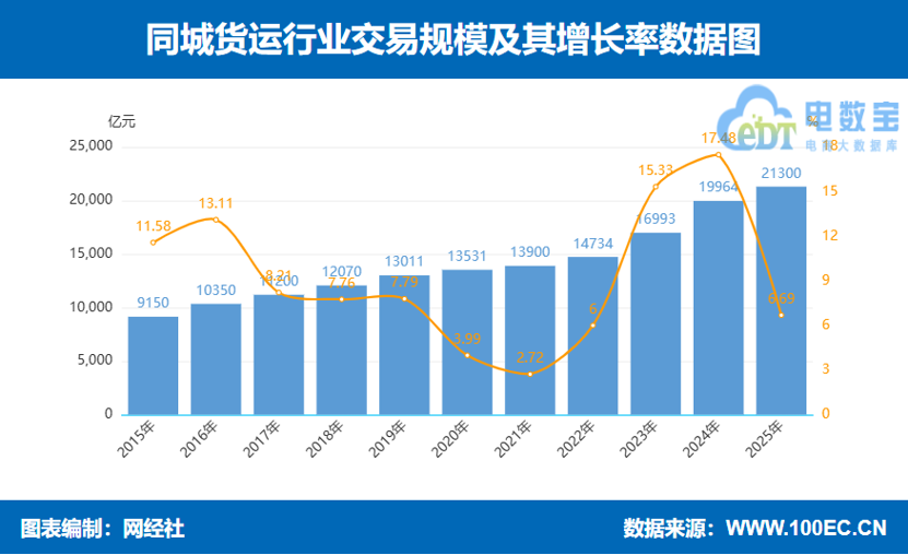 据“电数宝”数据显示,2025年同城货运市场规模为21300亿元,同比增长6.69%,增速回落。