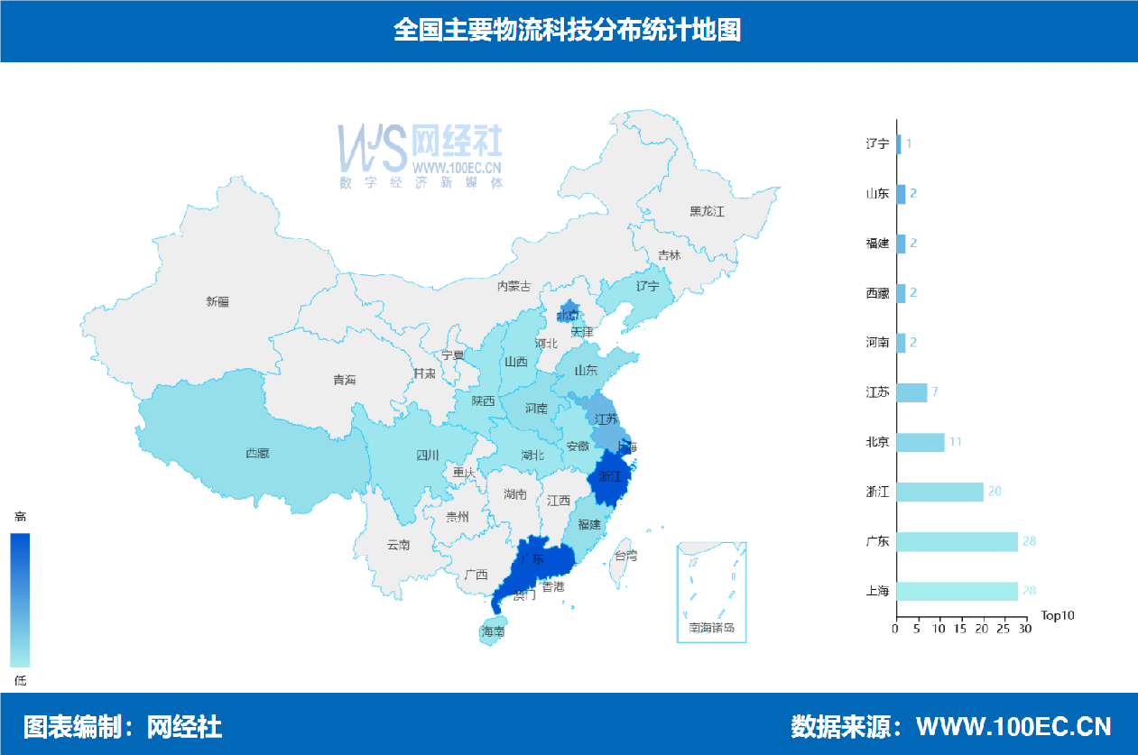 网经社企业库显示,主要物流科技企业有103家,其中上海、广东均分布了28家,浙江20家,北京11家,江苏7家,河南、西藏、福建、山东均2家,辽宁1家。
