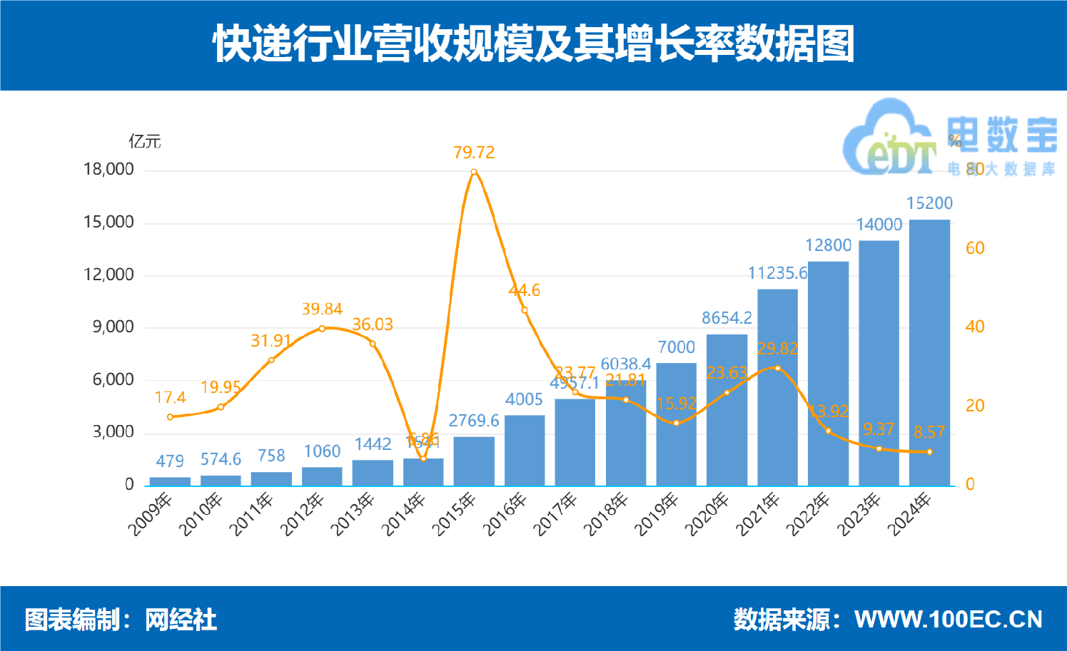 据“电数宝”数据显示,2024年快递行业营收规模15200亿元,增速8.57%。
