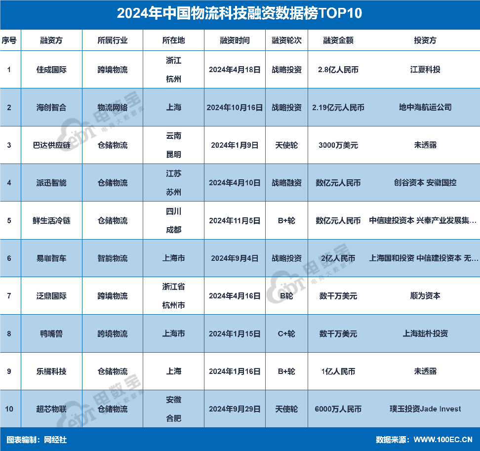 据网经社“电数宝”电商大数据库显示,2024年物流科技24起融资事件中,融资额排名前十的为:佳成国际(2.8亿人民币)、海创智合(2.19亿元人民币)、巴达供应链(3000万美元)、派迅智能(数亿元人民币)、鲜生活冷链(数亿元人民币)、易咖智车(2亿人民币)、泛鼎国际(数千万美元)、鸭嘴兽(数千万美元)、乐橘科技(1亿人民币)、超芯物联(6000万人民币)。