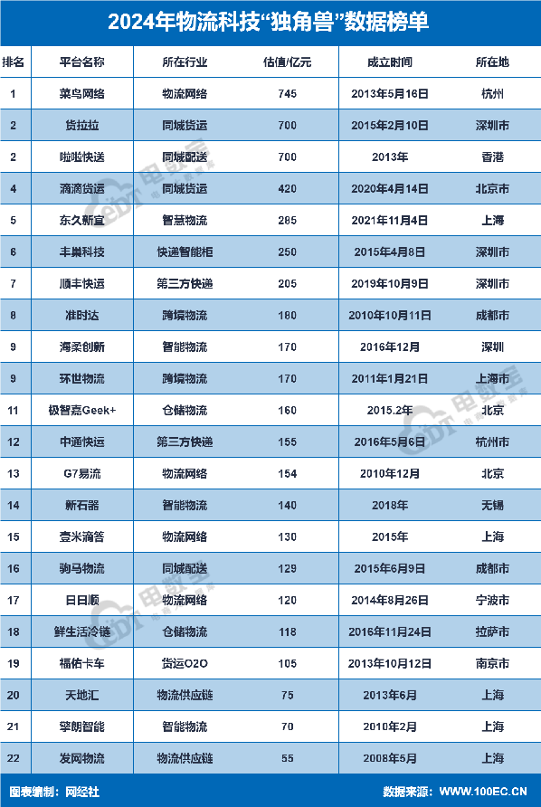 据“电数宝”(DATA.100EC.CN)显示,2024年,物流科技共有22家“独角兽”,总估值5236亿元。其中,菜鸟网络以745亿元估值位列“独角兽”榜第一名。第2至22名分别为:货拉拉、啦啦快送、滴滴货运、东久新宜、丰巢科技、顺丰快运、准时达、海柔创新、环世物流、极智嘉Geek+、中通快运、G7易流、新石器、壹米滴答、驹马物流、日日顺、鲜生活冷链、福佑卡车、天地汇、擎朗智能、发网物流。