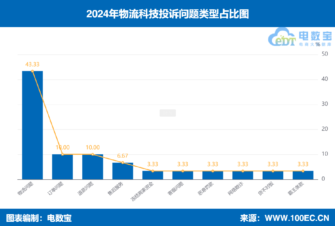 国内知名网络消费纠纷调解平台“电诉宝”受理用户维权案例显示, 2024年全国物流科技用户投诉问题类型主要包括:物流问题、订单问题、退款问题、售后服务、冻结商家资金、客服问题、恶意罚款、网络欺诈、货不对板、霸王条款。