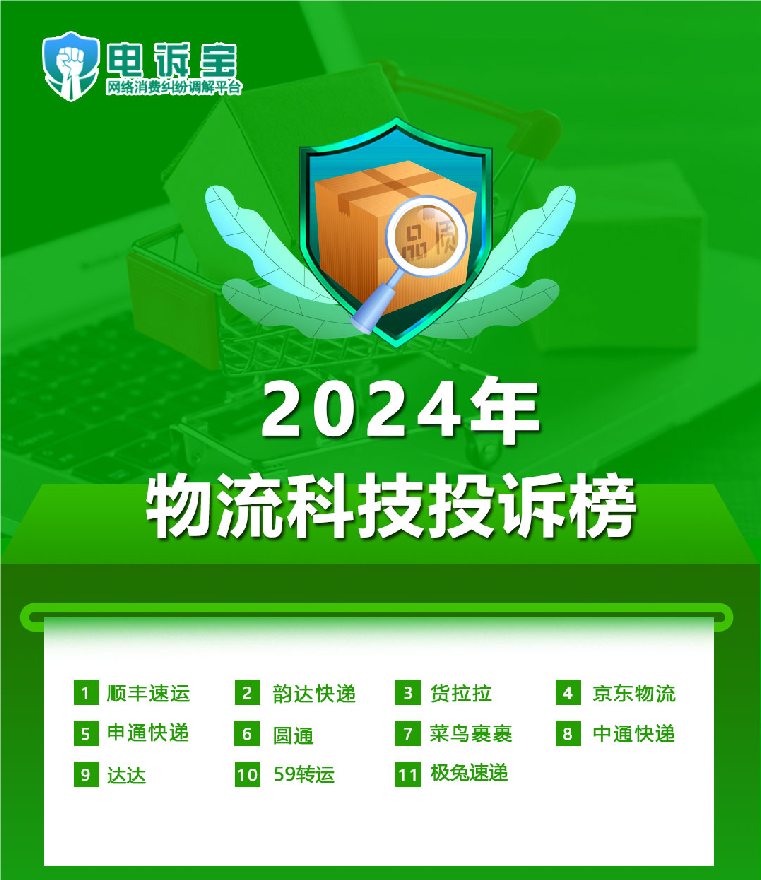 根据“电诉宝”2024年受理的物流科技领域用户有效投诉显示,共有11家上榜公司,按投诉数量入选投诉榜的依次为:顺丰速运、韵达快递、货拉拉、京东物流、申通快递、圆通、菜鸟裹裹、中通快递、达达、59转运、极兔速递。