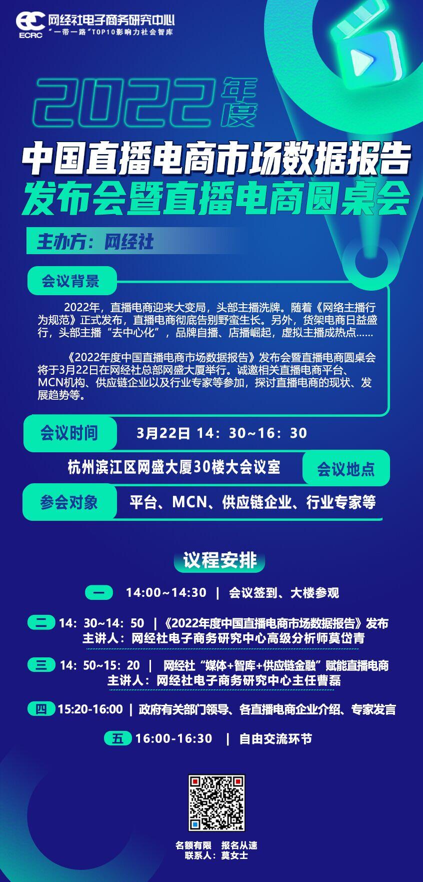 3月22日,由网经社主办的《2022年度中国直播电商市场数据报告》发布会暨直播电商圆桌会在网经社总部网盛大厦召开。本次大会,快手、谦寻、交个朋友、辛选集团、锐趣文化、君盟集团、丽客直播、元禾文旅等MCN机构,圣新淘、胜天半子、鸭鸭羽绒服、建发集团等供应链企业,慧策(旺店通)、天娱数科等服务商,共计近40家知名企业参会。此外,大会还邀请了中国(杭州)直播电商研究院执行院长、浙江传媒学院副教授、硕士生导师应中迪,赢动教育CEO崔立标,《网红经纪(MCN)合规与法律指南》作者黄伟律师等知名专家出席。