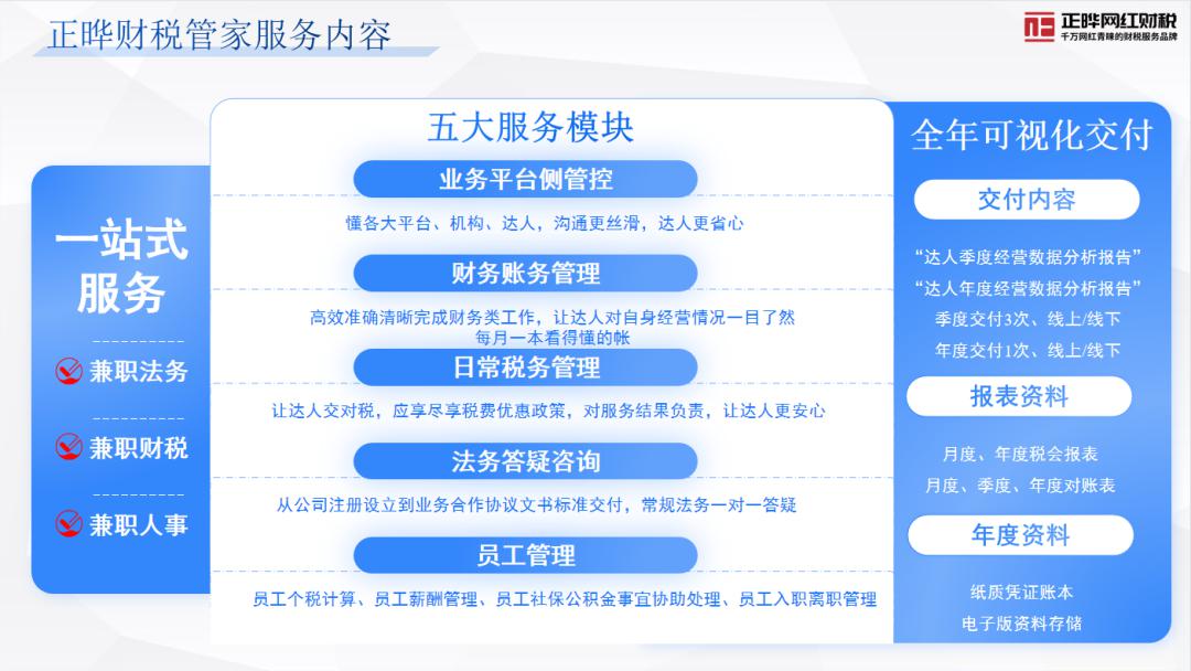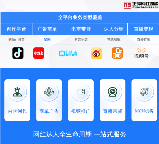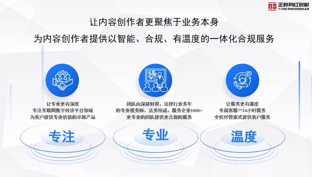 正晔网红财税隶属于正晔数科集团,专注于网红达人合规领域,为达人主播提供以 智能、合规、有温度的一体化合规服务为核心的一站式企业服务,已服务上 千家网红达人,覆盖粉丝数量10亿+。